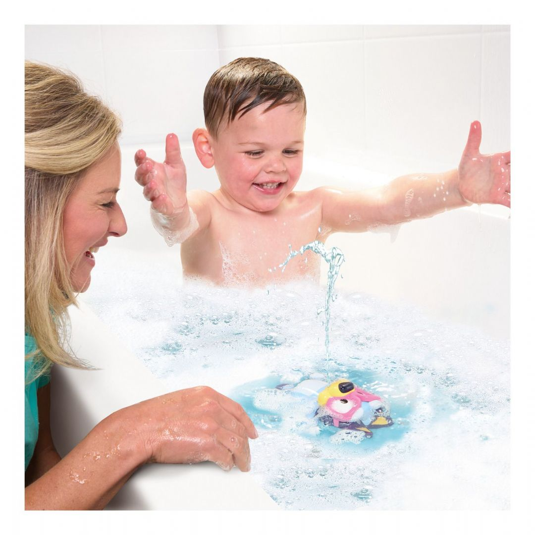 Gør badetiden endnu sjovere med Toomies Swim School Bluey – et sødt og interaktivt badelegetøj, der forvandler badekar eller soppebassin til et lille springvandsshow. Bluey flyder på ryggen i vandet, og når barnet (ofte med lidt hjælp fra en voksen) trækker i halen, fyldes figuren med vand. Når halen slippes, skyder Bluey vand op i en imponerende fontæne, som kan nå op til ca. 40 cm. Det giver masser af grin og gentagelsesleg, fordi børn hurtigt lærer sammenhængen mellem træk og slip og den sprøjtende effekt.