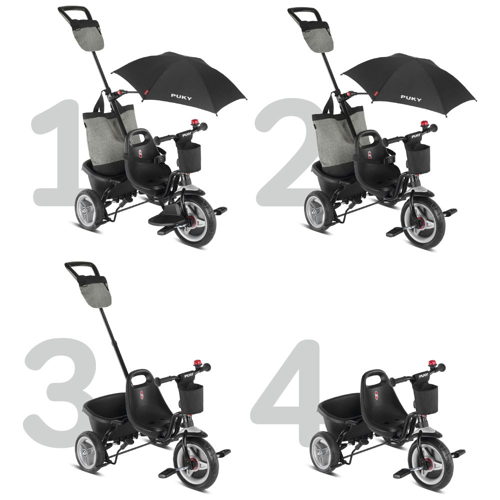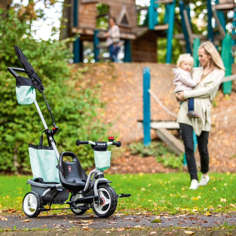 Trehjulede cykler udvikler børn ved at lærer dem at koordinere flere handlinger på samme tid (træde i pedalerne, styre og bremse). PUKY CEETY er udstyret med de vedligeholdelsesfri bløde komfortdæk og er ideel til både korte og længere strækninger. Da forældrene har muligheden for at skubbe børnene, når kræfterne slipper op. PUKY Ceety Comfort har en stor indkøbstaske og en tilbehørstaske på skubbestangen, hvilket gør det nemt at handle med barnet. Det aftagelige tippelad, den børnevenlige, roterende ringeklokke, fleksibel paraply og 3-punkts bæltesystemet sikre barnet en sjov og sikker cykeltur uden begrænsninger! Drevet, der er udstyret med et frihjul, kan låses og en aftageligt antislid fodstøtte med vinkeljustering fungerer som fodstøtte under hvile-/glidefasen. Så du fortsat kan transportere det sovende barn let og sikkert. De vedligeholdelsesfrie komfortdæk og kugleleje hjul garanterer jævn kørsel og holdbarhed.