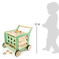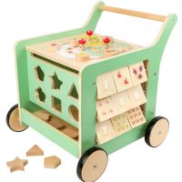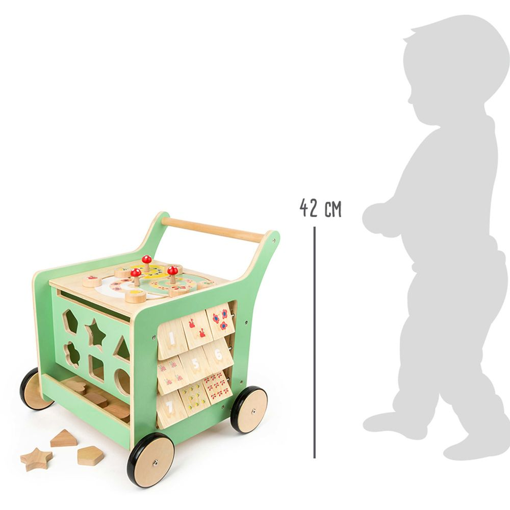 Denne gåvogn i træ kombinerer funktionalitet og minimalistisk design. Den tilbyder sjove aktiviteter som at dreje, sætte klodser i og tegne. Det øverste bræt kan løftes for ekstra opbevaringsplads til legetøj. Med bremsesystemet sikres en tryg og stabil læring af gang. En praktisk og stilfuld hjælp til de første skridt!
