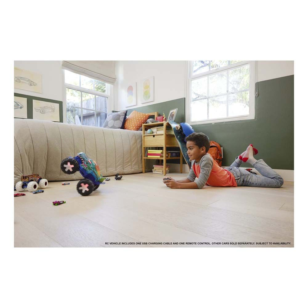 Den legendariske Hot Wheels Monster Trucks Mega-Wrex kommer til live i skalaen 1:15 med interaktive lys og lyde samt tre spiltilstande! I Hunt-tilstand aktiveres Mega-Wrex og følger sit bytte - hver gang den rammer, aktiveres lys og lyde. Den tager udfordrere op med et stort brøl i Smasher-tilstand, hvor dens lyde og vildskab øges, jo mere den smadrer. I Guard-tilstand genoplader Mega-Wrex med en blid glød og er klar til at vågne til live på ethvert tidspunkt. Hver interaktion ledsages af lys og lyde, der inspirerer til dynamisk leg og fantasifuld historiefortælling.