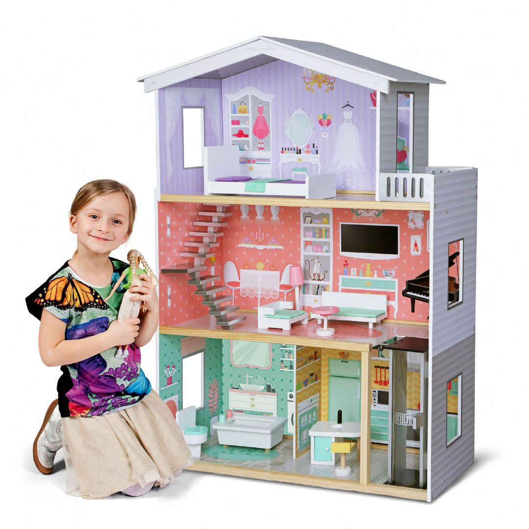 Fuldt møbleret solidt kvalitets trædukkehus i 3 etager. Huset tilbyder masser af legeværdi.