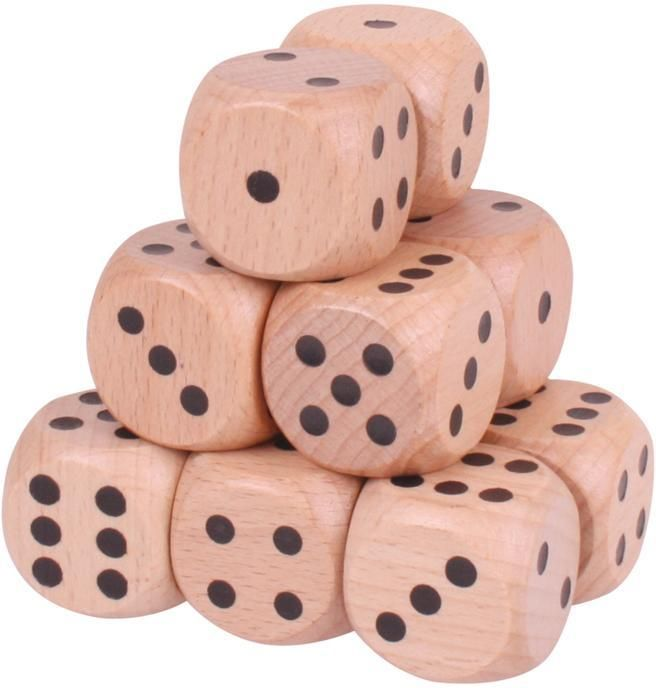 Store naturfarvede terninger i træ til leg og spil. Produktet indeholder 12 terninger.
