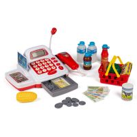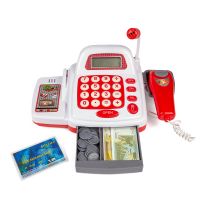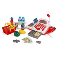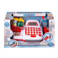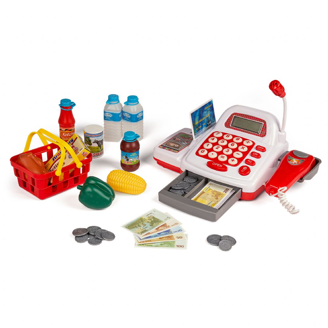 Kasseapparat med tilbehør Med mikrofon, regnemaskine, scanner, kreditkort, penge, indkøbskurv og varer. Ekskl. 3 stk. AA-batterier.