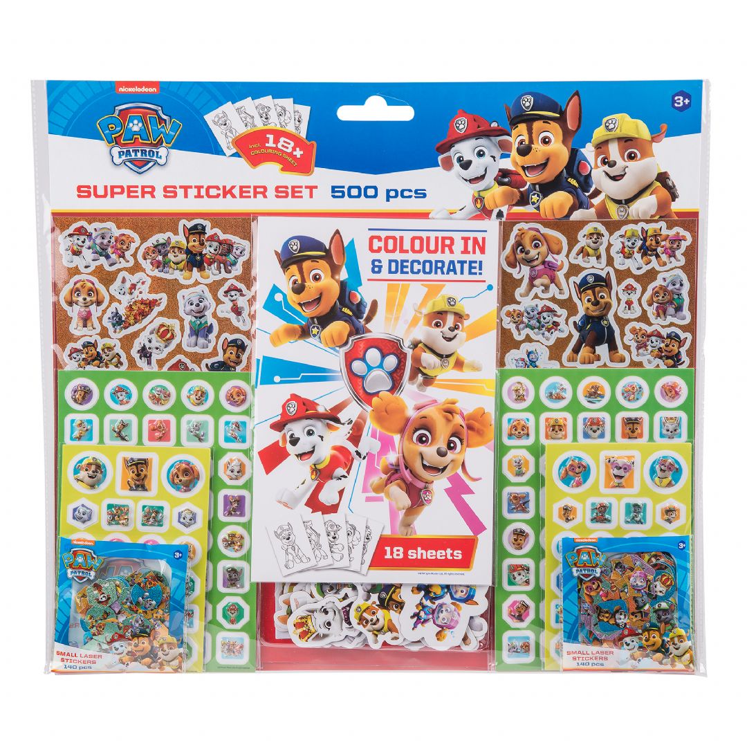 Paw Patrol super stickersæt Med 500 klistermærker, 32 mal selv-sider og 12 farvestifter.