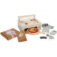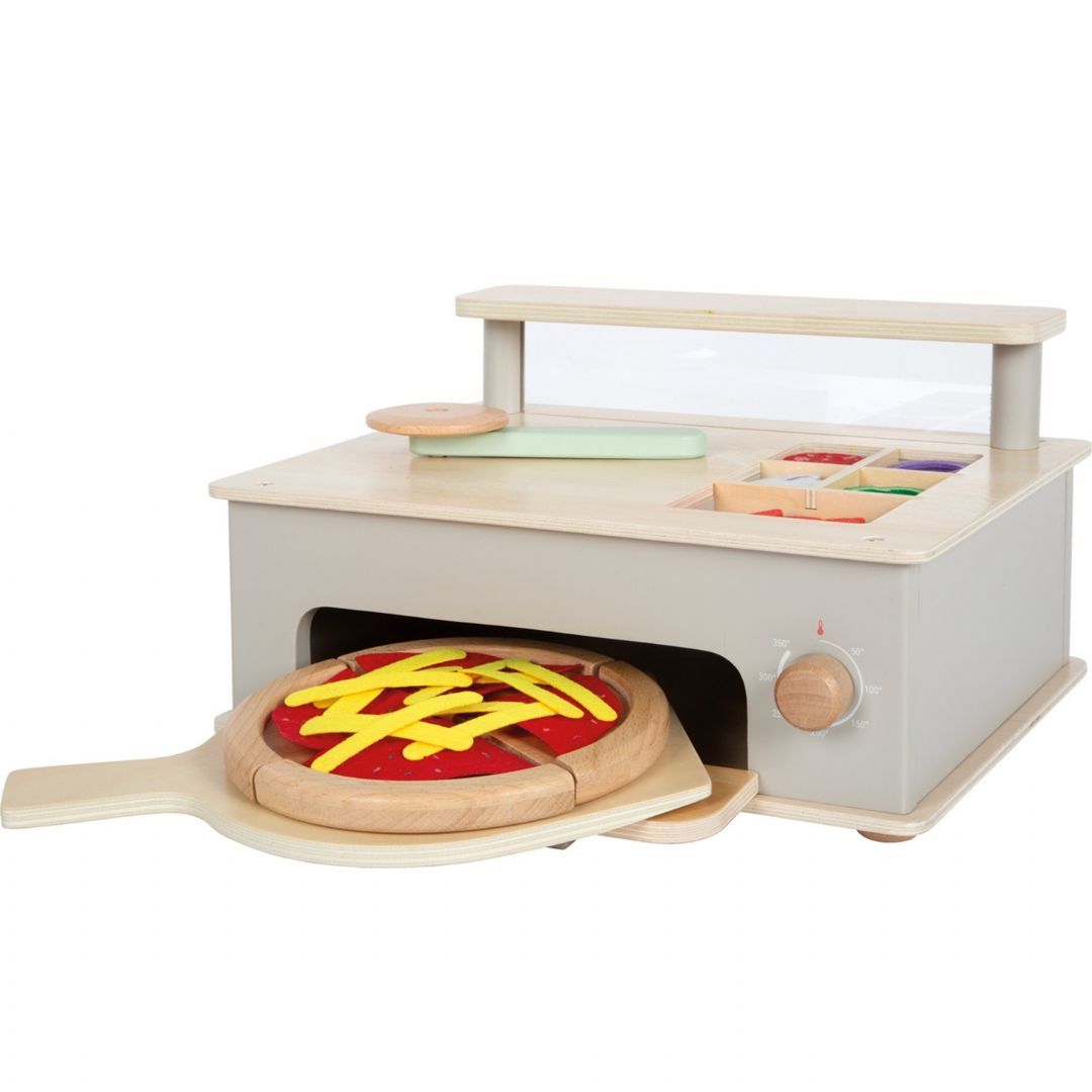 Den solide pizzaovn i træ fungerer både som ovn, opbevaringsplads og salgsskranke – komplet med praktiske rum til ingredienserne. Med pizzaer, der kan skilles ad med velcro, en roterende pizzaskærer, menuer med priser og endda en kassebælte med pung, legetøjspenge og kortlæser, er legen både realistisk og sjov.