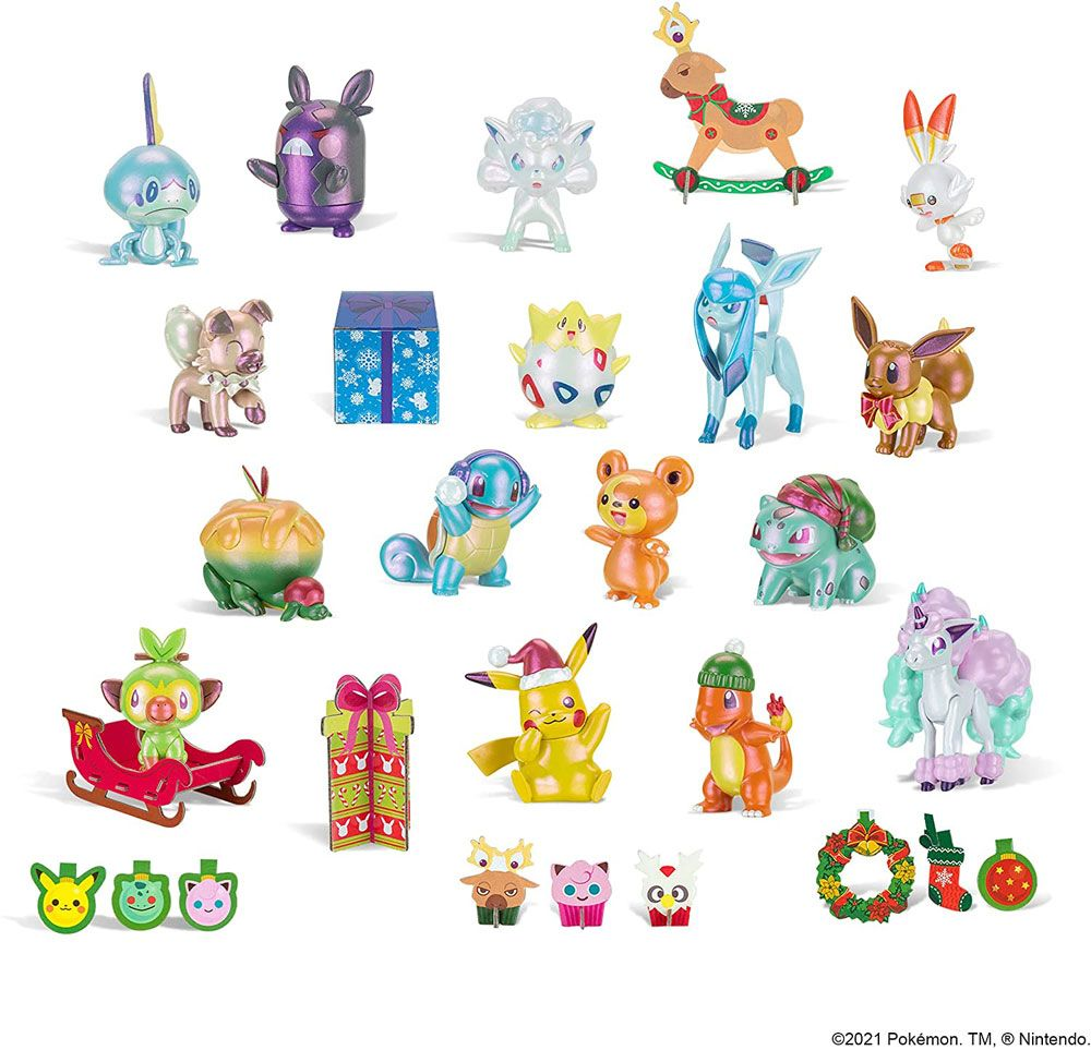 Bag hver låge gemmer der sig 1 ud af 16 inkluderede Pokemon-figurer, som har et flot perlefinish og et juletema. Børn kan finde alle deres favorit pokemons som Pikachu, Bulbasaur, Squirtle, Charmander og mange flere. Alle inkluderede figurer er inspireret af The Pokemon Animated Series. Der medfølger også 1 ud 18 stykker tilbehør i juletema