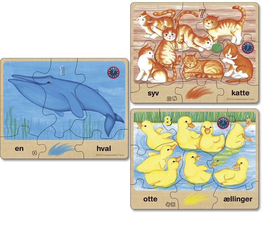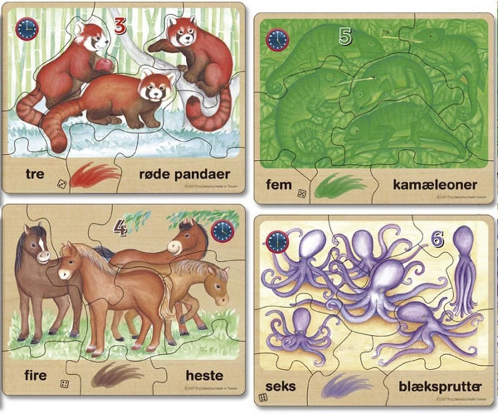 puslespil med tal som illustrerer tal, dyr og farver. Hvert puslespil har 7-9 træbrikker og viser et dyr med navn og farve f.eks. ællinger og en gul farveklat. Antal i cifre f.eks. "8", antal i bogstaver f.eks "otte", antal øjne på terning. Klokkesæt på et ur med visere.