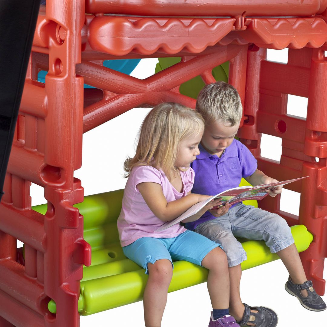 Legetårnet er designet med to stiger, så børn nemt kan klatre op til platformen, hvorfra de kan suse ned ad rutsjebanen igen og igen. Den smarte bænk kan desuden omdannes til en sandkasse, hvilket giver endnu flere legemuligheder i ét og samme produkt.